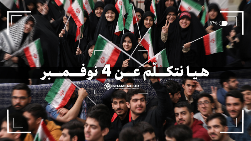 ينشر موقع KHAMENEI.IR الإعلامي مقطعًا مصوّرًا يعرض مقابلات أجريت مع تلامذة المدارس وطلاب الجامعات على هامش لقائهم بتاريخ 03/11/2025 مع الإمام الخامنئي في حسينية الإمام الخميني (قده)، ويتطرّق إلى الحديث عن سيطرة الطلاب بتاريخ 4 تشرين الثاني/ نوفمبر 1979 على السفارة الأمريكية في طهران، وهو اليوم الوطني لمقارعة الاستكبار العالمي.
