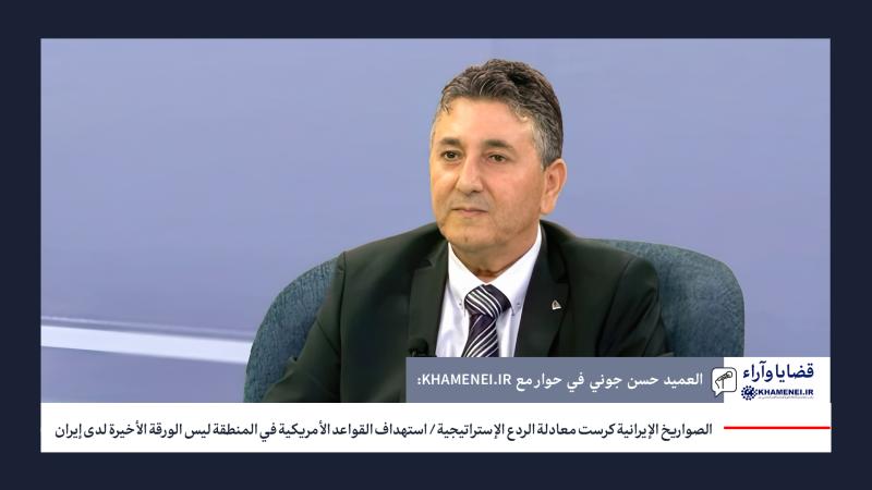 ينشر موقع KHAMENEI.IR الإعلامي نص الحوار الذي أجراه مع العميد حسن جوني، نائب رئيس هيئة أركان القوات المسلحة اللبنانية السابق، حول أبعاد الحرب التي فرضها الكيان الصهيوني وحلفاؤه على جمهورية إيران الإسلاميّة، وكيف أنّ الصواريخ الإيرانية كرّست معادلة ردع استراتيجية، ويقول أنّ استهداف القواعد الأمريكية في المنطقة ليس الورقة الأخيرة لدى إيران.