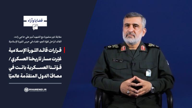 ينشر موقع KHAMENEI.IR الإعلامي النص الكامل للحوار الذي أجراه في العام 2021 ميلادي مع الشهيد اللواء أمير علي حاجي زاده، ويُنشر للمرّة الأولى، وجرى فيه التطرّق إلى الدور المحوري لقائد الثورة الإسلامية الإمام الخامنئي في النهوض بالقدرات الدفاعية والعسكرية للجمهورية الإسلامية، وجهوده الحاسمة في إدارة الأزمات، وتوجيهاته المصيرية التي أرست أسس الاكتفاء الذاتي في مجال التسليح، لا سيما في تطوير الصواريخ والطائرات المسيّرة، فضلًا عن رؤيته العميقة في بناء الروح العقائدية والمعنوية للقوّات المسلحة.