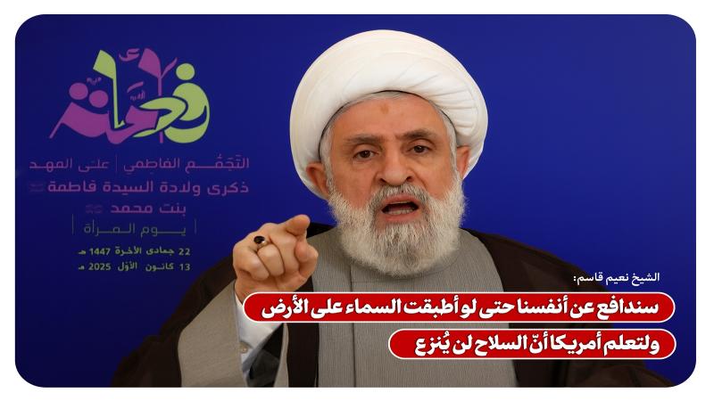 ينشر موقع KHAMENEI.IR الإعلامي نص كلمة الأمين العام لحزب الله سماحة الشيخ نعيم قاسم بتاريخ 13/11/2025 في التجمع الفاطمي الذي أقيم في ضاحية بيروت الجنوبية، حيث أكّد فيها ثوابت المقاومة وخياراتها الوطنية، محذّرًا من خطورة المشروع الأميركي–الإسرائيلي الساعي إلى نزع سلاح المقاومة وإضعاف لبنان، ومشدّدًا على أن الأرض والسلاح والإنسان يشكّلون وحدة وجودية لا تقبل التفكيك، وأن أي مساس بها هو استهداف مباشر لوجود الوطن ومستقبله.