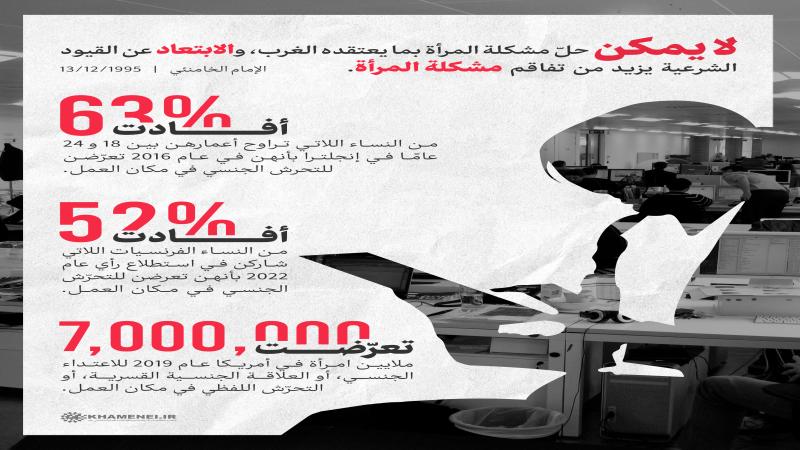 ينشر موقع KHAMENEI.IR الإعلامي تصاميم تتضمّن إنفوغرافات تعرض إحصائيّات وتفاصيل حول الوضع الذي تعيشه المرأة في الغرب وما تعانيه من مشكلات في ظلّ الأنظمة التي تسود بلدانه.
