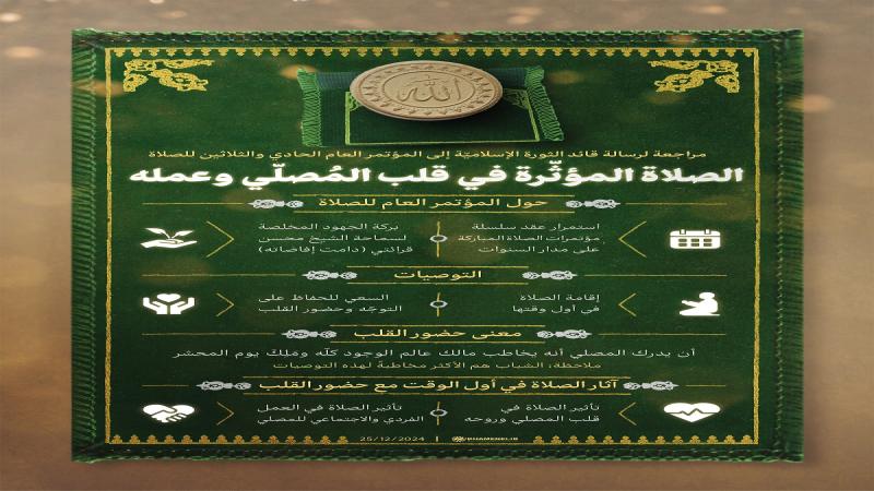 ينشر موقع KHAMENEI.IR الإعلامي إنفوغرافًا يعرض ما جاء في رسالة قائد الثورة الإسلاميّة الإمام الخامنئي بتاريخ 25/12/2024 إلى المؤتمر العام الحادي والثلاثين للصلاة.