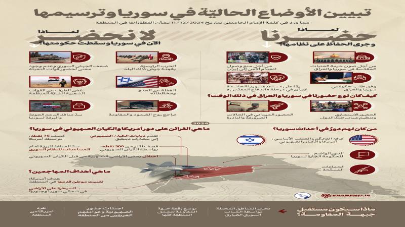 ينشر موقع KHAMENEI.IR الإعلامي إنفوغرافًا يُبين الأوضاع الحالية في سوريا على ضوء ما ورد في كلمة الإمام الخامنئي بتاريخ 11/12/2024 بشأن التطوّرات في المنطقة.