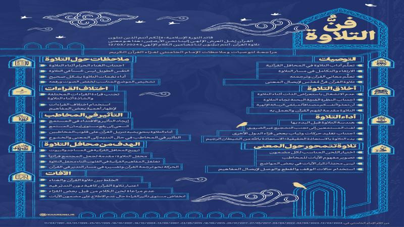 ينشر موقع KHAMENEI.IR الإعلامي إنفوغرافاً يتضمّن توصيات الإمام الخامنئي وملاحظاته لقرّاء القرآن الكريم والتي جاءت في كلمته بتاريخ 12/3/2024 خلال محفل الأنس بـ«القرآن الكريم».