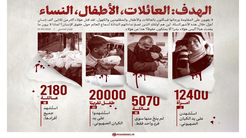 ينشر موقع KHAMENEI.IR الإعلامي إنفوغرافًا يعرض حجم الإجرام الذي يمارسه الكيان الصهيوني في قطاع غزّة وإحصائيّات تدلّ على استهدافه الوحشي للعائلات، والنساء والأطفال.