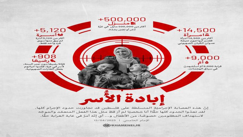 ينشر موقع KHAMENEI.IR الإعلامي إنفوغرافًا يعرض إحصائيّات تتناول الجرائم التي ارتكبها ويرتكبها الكيان الصهيوني في غزّة وتستهدف الأسر والنساء والأطفال والمنازل، والتي شكّلت مستوى جديدًا من الإجرام على مستوى العالم.