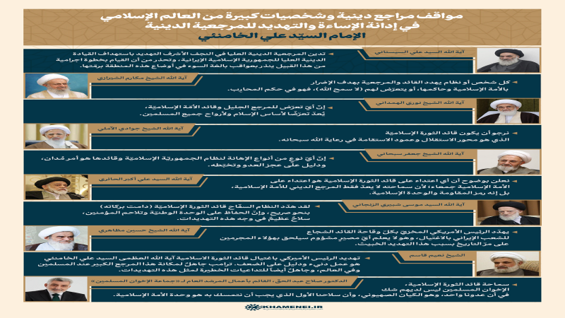 ينشر موقع KHAMENEI.IR الإعلامي إنفوغرافًا يتضمّن مواقف مراجع دينية ورموز كبيرة من العالم الإسلامي في إدانة الإساءة والتهديد للمرجعية الدينية، الإمام السيّد علي الخامنئي.