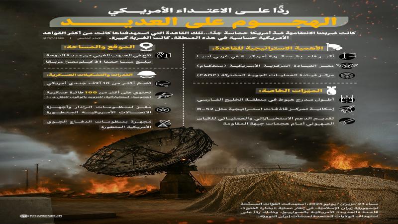 ينشر موقع KHAMENEI.IR الإعلامي إنفوغرافًا يعرض معلومات وأهميّة قاعدة العديد الأمريكيّة في قطر التي استهدفتها القوّات المسلّحة لجمهوريّة إيران الإسلاميّة بالصواريخ، ردّاً على استهداف الولايات المتحدة لمنشآت إيران النوويّة.