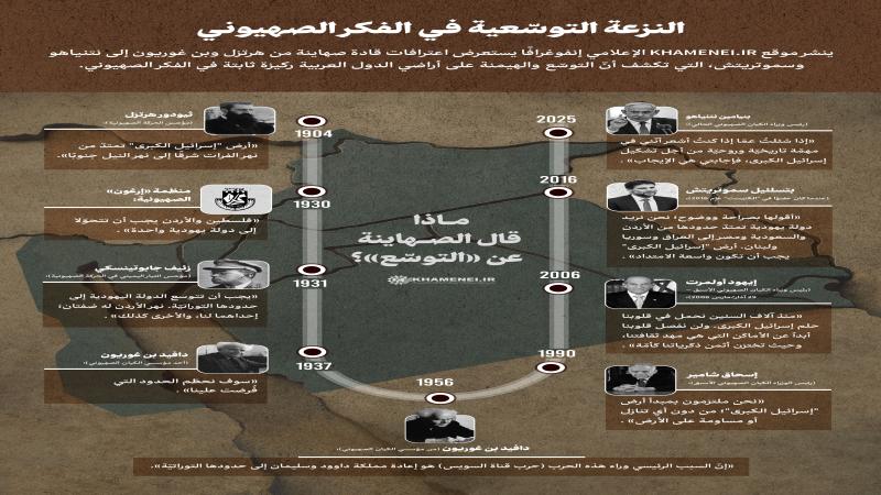 ينشر موقع KHAMENEI.IR الإعلامي إنفوغرافًا يستعرض اعترافات قادة صهاينة من هرتزل وبن غوريون إلى نتنياهو وسموتريتش، التي تكشف أنّ التوسّع والهيمنة على أراضي الدول العربية ركيزة ثابتة في الفكر الصهيوني.