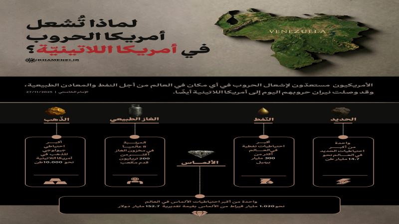 ينشر موقع KHAMENEI.IR الإعلامي إنفوغرافًا يعرض بالأرقام والإحصائيات السبب الذي يدفع أمريكا لإشعال الحرب في فنزويلا الواقعة في أمريكا اللاتينية.